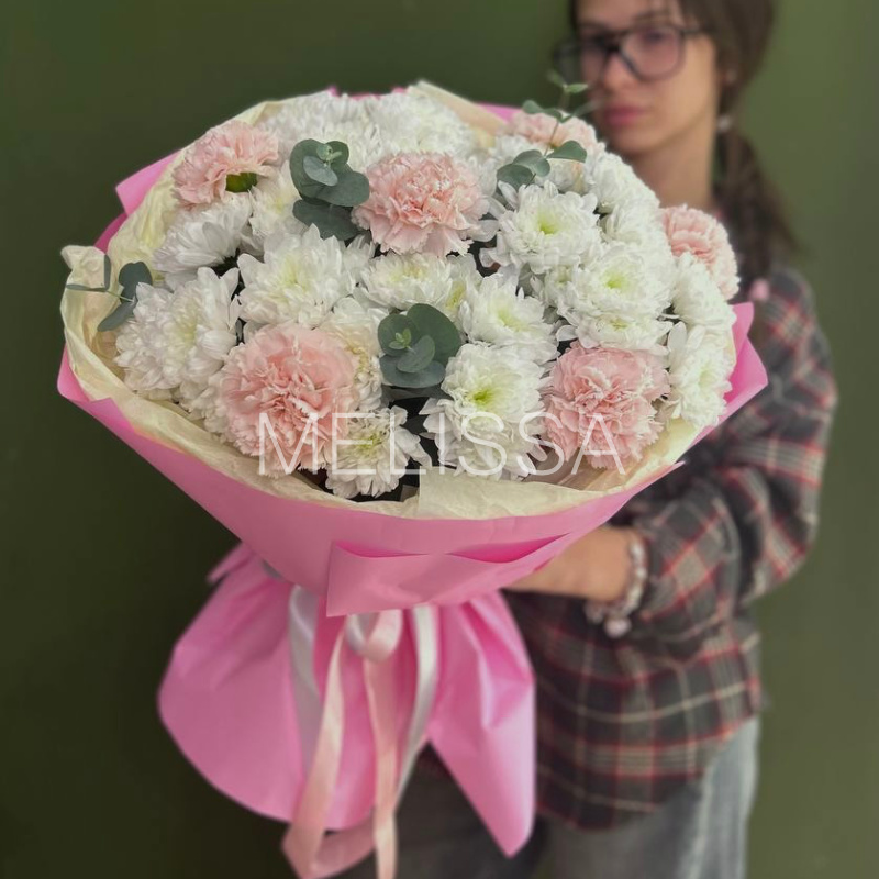 🌿 Аромат эвкалипта и нежные оттенки хризантем и диантусов... Этот букет - настоящее наслаждение для чувств! 🌸