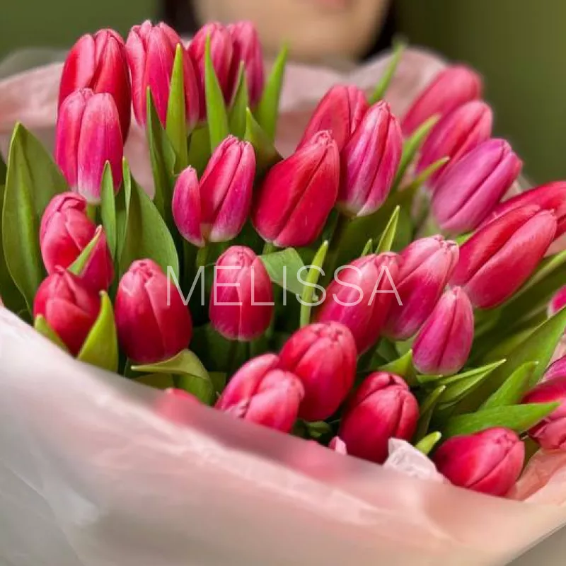Букет из ярких розовых тюльпанов, завернутый в прозрачную пленку и белую бумагу. Нежные оттенки цветов создают трогательный и романтичный образ, идеальный для подарка или особого случая. Букет излучает свежесть и яркость, привлекая внимание своей красотой и элегантностью.